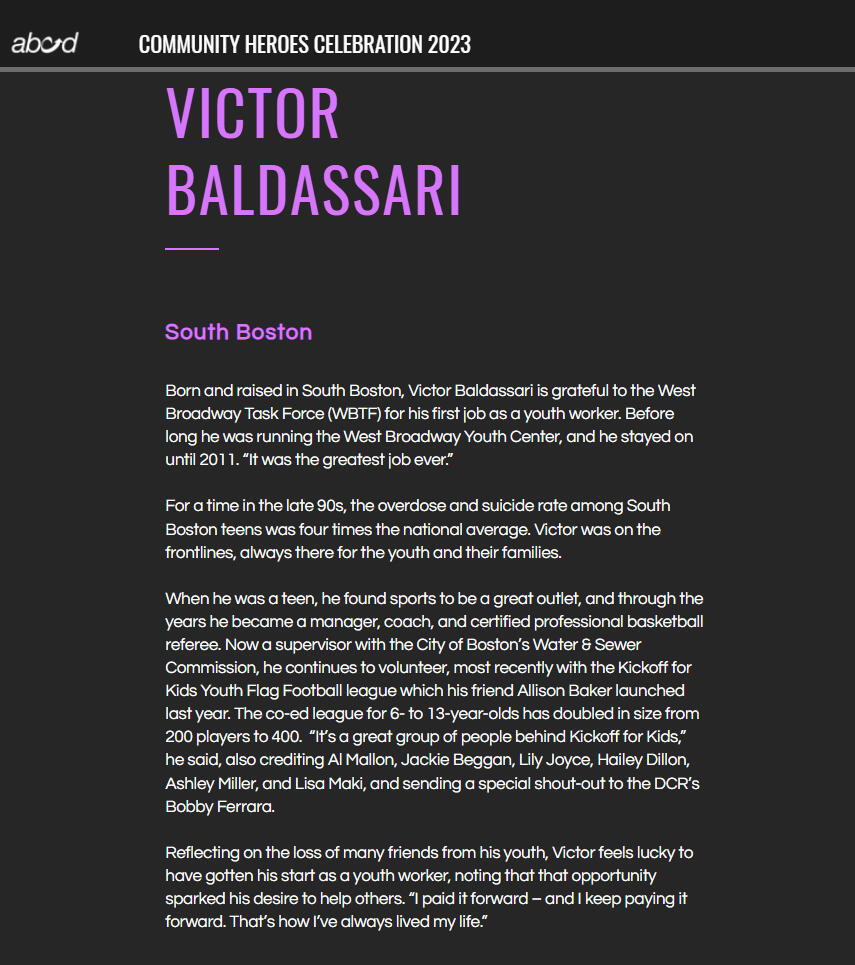 Born and raised in South Boston, Victor Baldassari is grateful to the West Broadway Task Force (WBTF) for his first job as a youth worker. Before long he was running the West Broadway Youth Center, and he stayed on until 2011. “It was the greatest job ever.”For a time in the late 90s, the overdose and suicide rate among South Boston teens was four times the national average. Victor was on the frontlines, always there for the youth and their families.When he was a teen, he found sports to be a great outlet, and through the years he became a manager, coach, and certified professional basketball referee. Now a supervisor with the City of Boston’s Water & Sewer Commission, he continues to volunteer, most recently with the Kickoff for Kids Youth Flag Football league which his friend Allison Baker launched last year. The co-ed league for 6- to 13-year-olds has doubled in size from 200 players to 400. “It’s a great group of people behind Kickoff for Kids,” he said, also crediting Al Mallon, Jackie Beggan, Lily Joyce, Hailey Dillon, Ashley Miller, and Lisa Maki, and sending a special shout-out to the DCR’s Bobby Ferrara.Reflecting on the loss of many friends from his youth, Victor feels lucky to have gotten his start as a youth worker, noting that that opportunity sparked his desire to help others. “I paid it forward – and I keep paying it forward. That’s how I’ve always lived my life.”