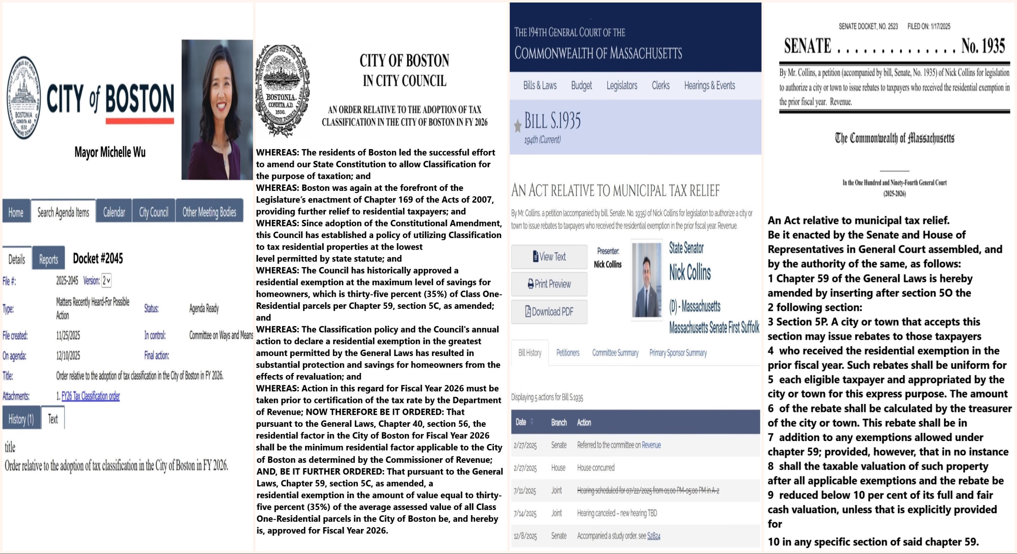 Goal: This fosters trust and allows all stakeholders—city, state, residents, and businesses—to plan for budget cycles with shared, verifiable information, making the process less contentious.Articles:City of Boston - Order relative to the adoption of tax classification in the City of Boston in FY 2026. Docket #2045