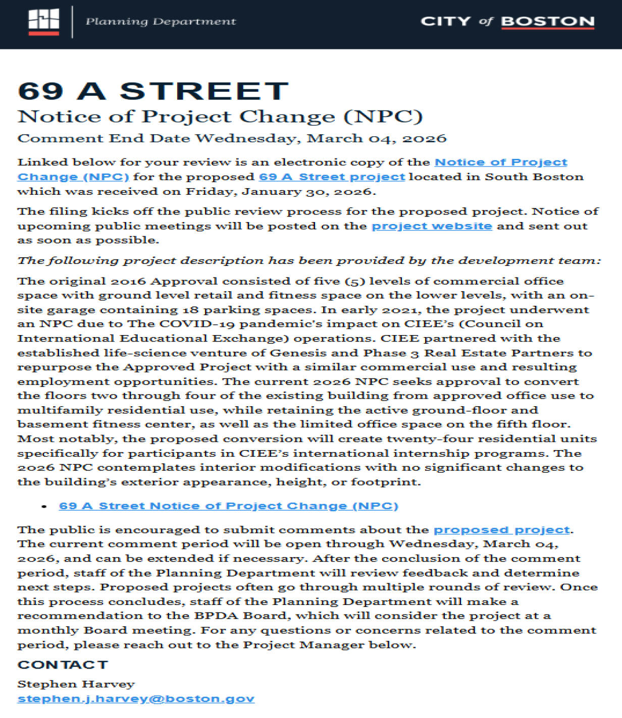 69 A STREET NOTICE OF PROJECT CHANGE (NPC)The original 2016 Approval consisted of five (5) levels of commercial office space with ground level retail and fitness space on the lower levels, with an on-site garage containing 18 parking spaces. In early 2021, the project underwent an NPC due to The COVID-19 pandemic's impact on CIEE’s (Council on International Educational Exchange) operations. CIEE partnered with the established life-science venture of Genesis and Phase 3 Real Estate Partners to repurpose the Approved Project with a similar commercial use and resulting employment opportunities. The current 2026 NPC seeks approval to convert the floors two through four of the existing building from approved office use to multifamily residential use, while retaining the active ground-floor and basement fitness center, as well as the limited office space on the fifth floor. Most notably, the proposed conversion will create twenty-four residential units specifically for participants in CIEE’s international internship programs. The 2026 NPC contemplates interior modifications with no significant changes to the building’s exterior appearance, height, or footprint.City of Boston Project Website: Link