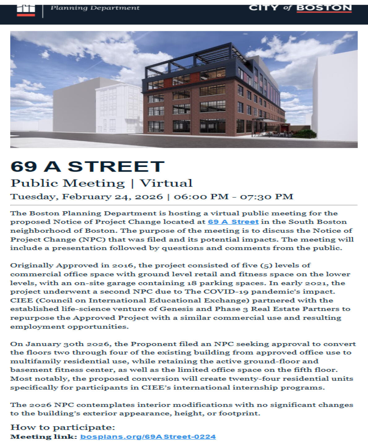 Meeting LinkThe original 2016 Approval consisted of five (5) levels of commercial office space with ground level retail and fitness space on the lower levels, with an on-site garage containing 18 parking spaces. In early 2021, the project underwent an NPC due to The COVID-19 pandemic's impact on CIEE’s (Council on International Educational Exchange) operations. CIEE partnered with the established life-science venture of Genesis and Phase 3 Real Estate Partners to repurpose the Approved Project with a similar commercial use and resulting employment opportunities. The current 2026 NPC seeks approval to convert the floors two through four of the existing building from approved office use to multifamily residential use, while retaining the active ground-floor and basement fitness center, as well as the limited office space on the fifth floor. Most notably, the proposed conversion will create twenty-four residential units specifically for participants in CIEE’s international internship programs. The 2026 NPC contemplates interior modifications with no significant changes to the building’s exterior appearance, height, or footprint.City of Boston Project Website: Link